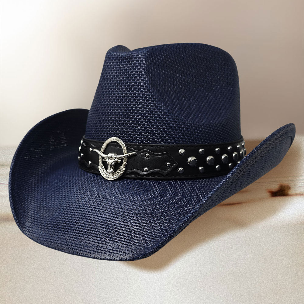 Embellished Metal Steer Head Studded Blue Western Straw Cowboy Fedora Hat