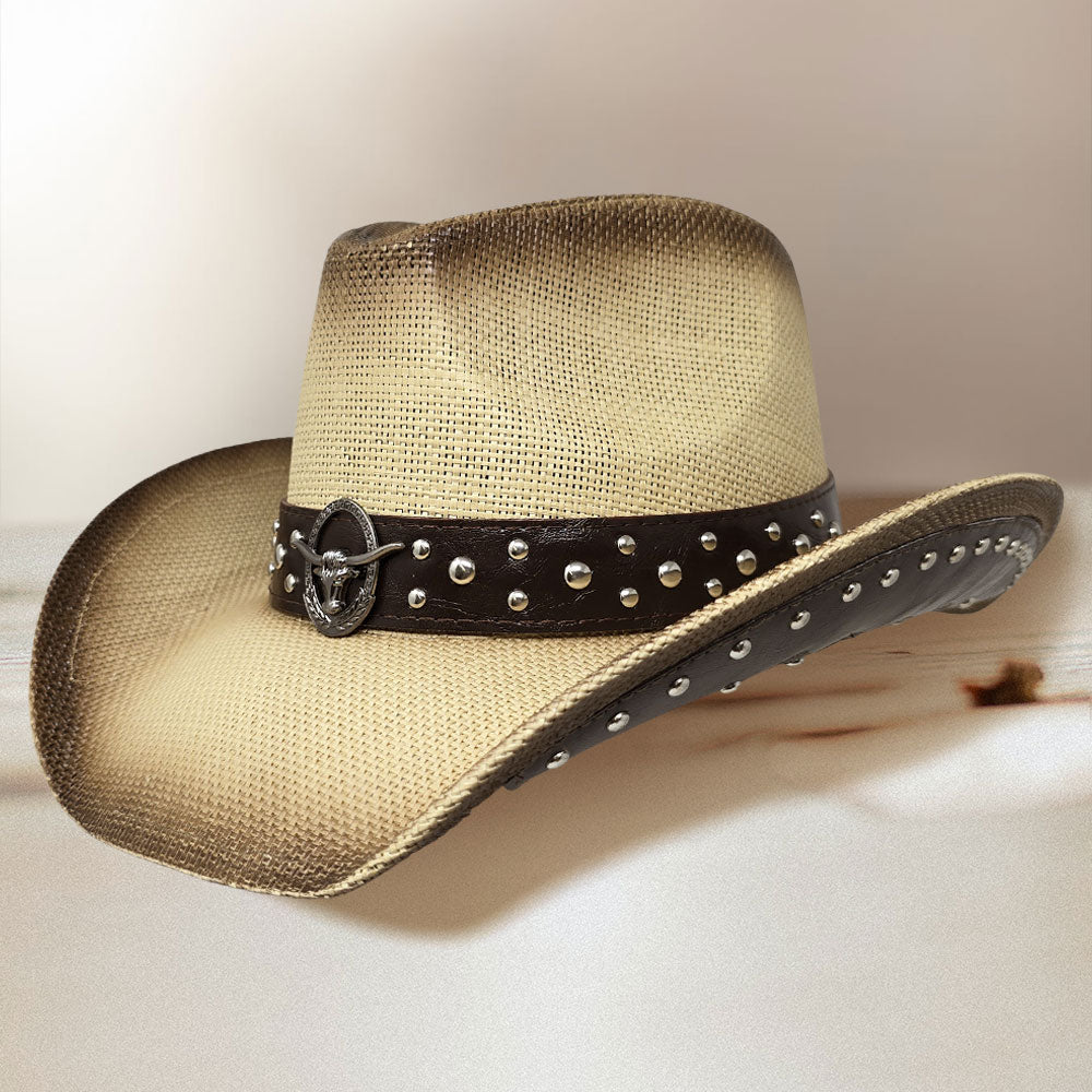 Embellished Metal Steer Head Studded Neutral Western Straw Cowboy Fedora Hat
