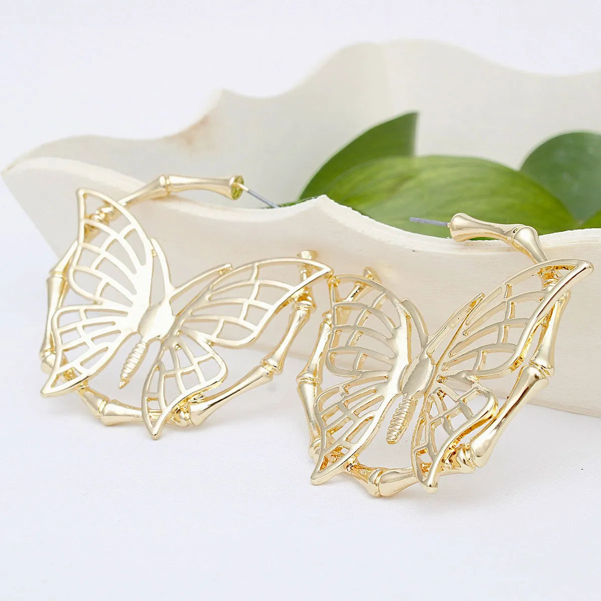 Hoop Dimensional Butterfly Gold Bamboo Earrings